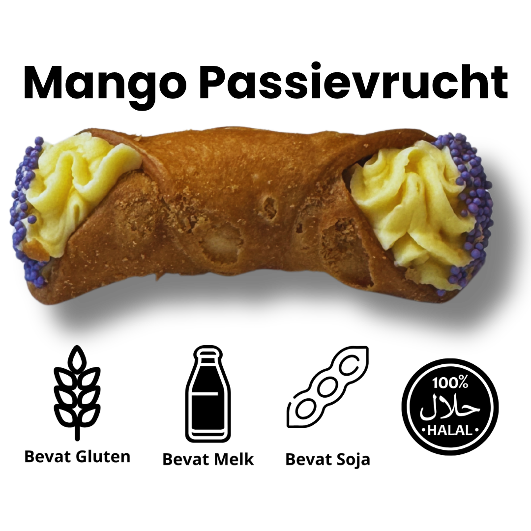 Deze tropisch frisse cannoli zijn gevuld met een fluweelzachte mango-passievruchtcrème op basis van witte chocolade. De exotische fruittonen zorgen voor een lichte, verfrissende smaak met een romige ondertoon – perfect als zomers dessert of kleurrijke aanvulling in een cannoli-assortiment.
